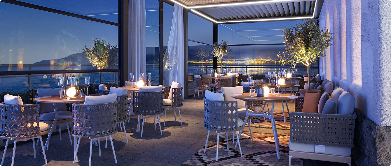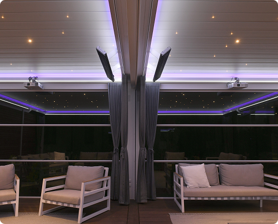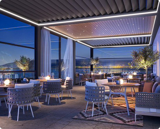 But there are also lots of opportunities for bar/restaurant patio. Let your guests enjoy a snack and a drink without exposing them to the elements. Thanks to the linked modules, it is also possible to cover a large patio and provide them with every comfort.